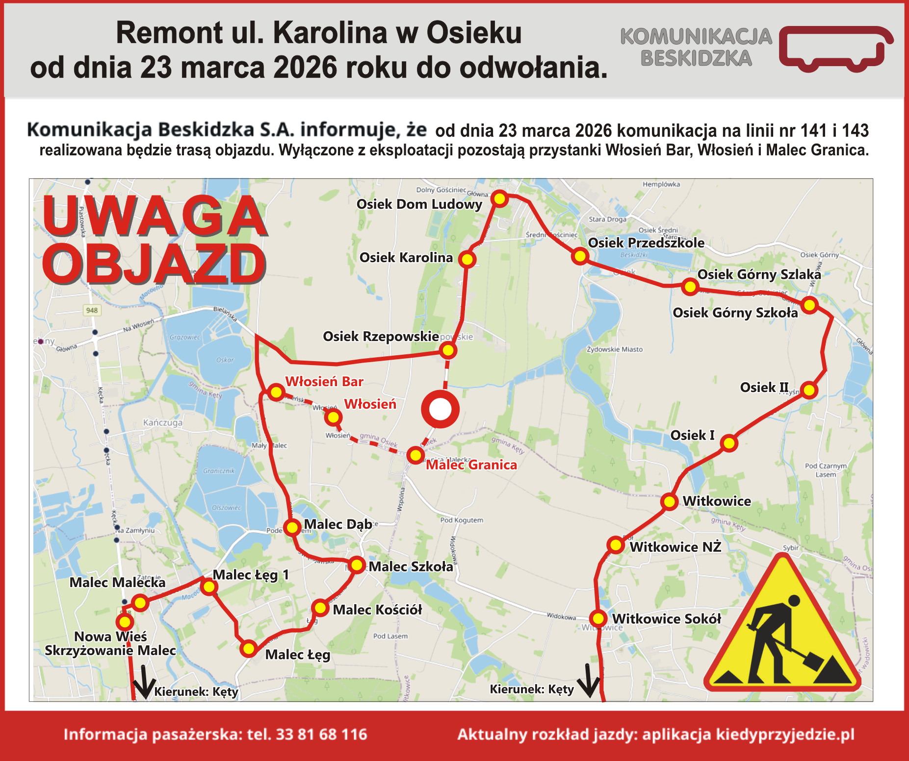 Komunikacja Beskidzka S.A. informuje, że od dnia 23 marca 2026 komunikacja na linii nr 141 i 143 realizowana będzie trasą objazdu. Wyłączone z eksploatacji pozostają przystanki Włosień Bar, Włosień i Malec Granica.